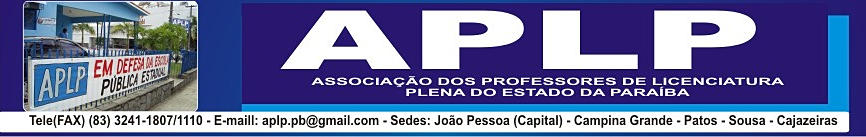 A ASSOCIAÇÃO DOS PROFESSORES DE LICENCIATURA PLENA DO ESTADO PARAÍBA (APLP), ante a discussão da Data Base do reajuste salarial da Classe, vem informar aos Professores e Professoras de toda a Rede Estadual de Ensino, que o governador Ricardo Coutinho, em uma atitude ditatorial, recusa--se, nega-se a receber esta Entidade, para tratar do tema referido, em que pese a solicitação de audiência ter sido protocolada desde novembro de 2014.
